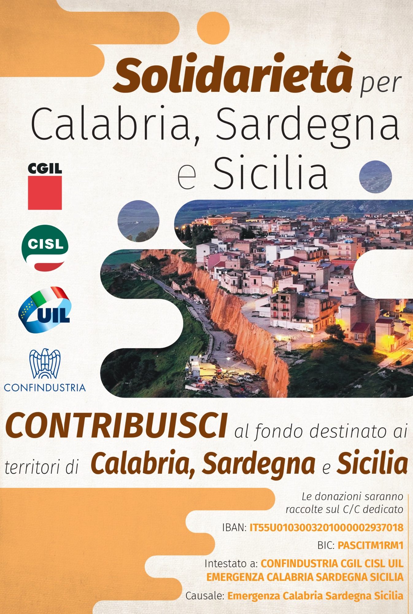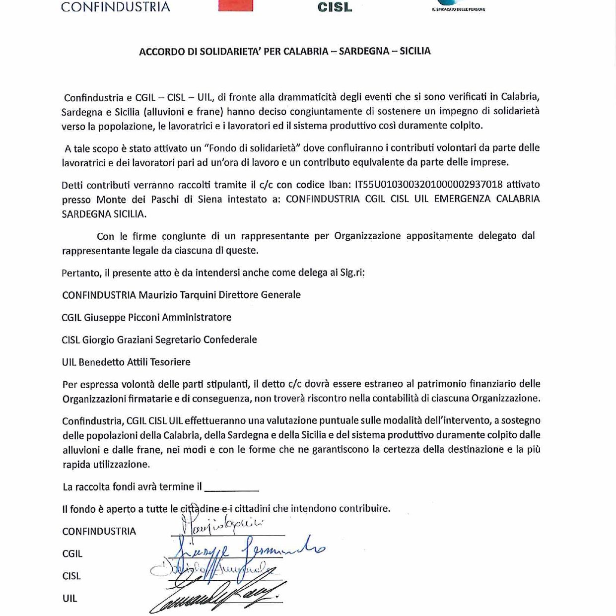 La trattenuta di una somma equivalente ad 1 (una) ora della retribuzione netta afferente il mese di ______________ 2026 da versare sul c/c bancario intestato a: CONFINDUSTRIA CGIL CISL UIL EMERGENZA CALABRIA SARDEGNA SICILIA ; cod. IBAN IT55U0103003201000002937018 ; BIC PASCITM1RM1 ; causale: EMERGENZA CALABRIA SARDEGNA SICILIA indicato dai promotori.